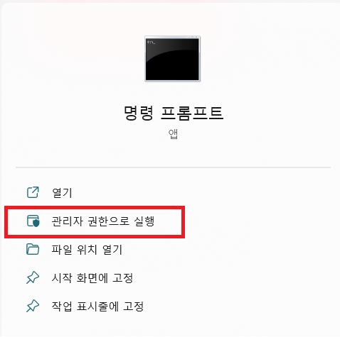 - ๊ทธ๋ฌ๋ฉด "๋ช ๋ น ํ๋กฌํํธ"๋ผ๋ ๋ฉ๋ด๊ฐ ๋ํ๋ฉ๋๋ค. ์ด๋ฅผ ์ฐํด๋ฆญํ๊ณ "๊ด๋ฆฌ์ ๊ถํ์ผ๋ก ์คํ"์ ์ ํํฉ๋๋ค.