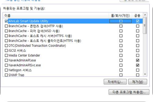 그럼 위의 설정 상자가 표시가 됩니다. 여기서 홈 / 공요 체크를 박스를 체크를 하시면 해당 프로그램은 예외가 적용이 됩니다. 하지만 원하는 프로그램이 없는 경우가 있습니다. 이런 경우 다른 프로그램 허용 버튼을 클릭을 해서 원하는 프로그램을 적용을 하여 주시면 됩니다.